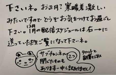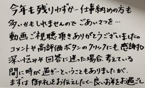 年末のご挨拶をYoutubeコミュニティで行ったのですが、端っこ見えませんでした…何度もアップするのもアレなので、全画面は以下です。こちらに掲載。